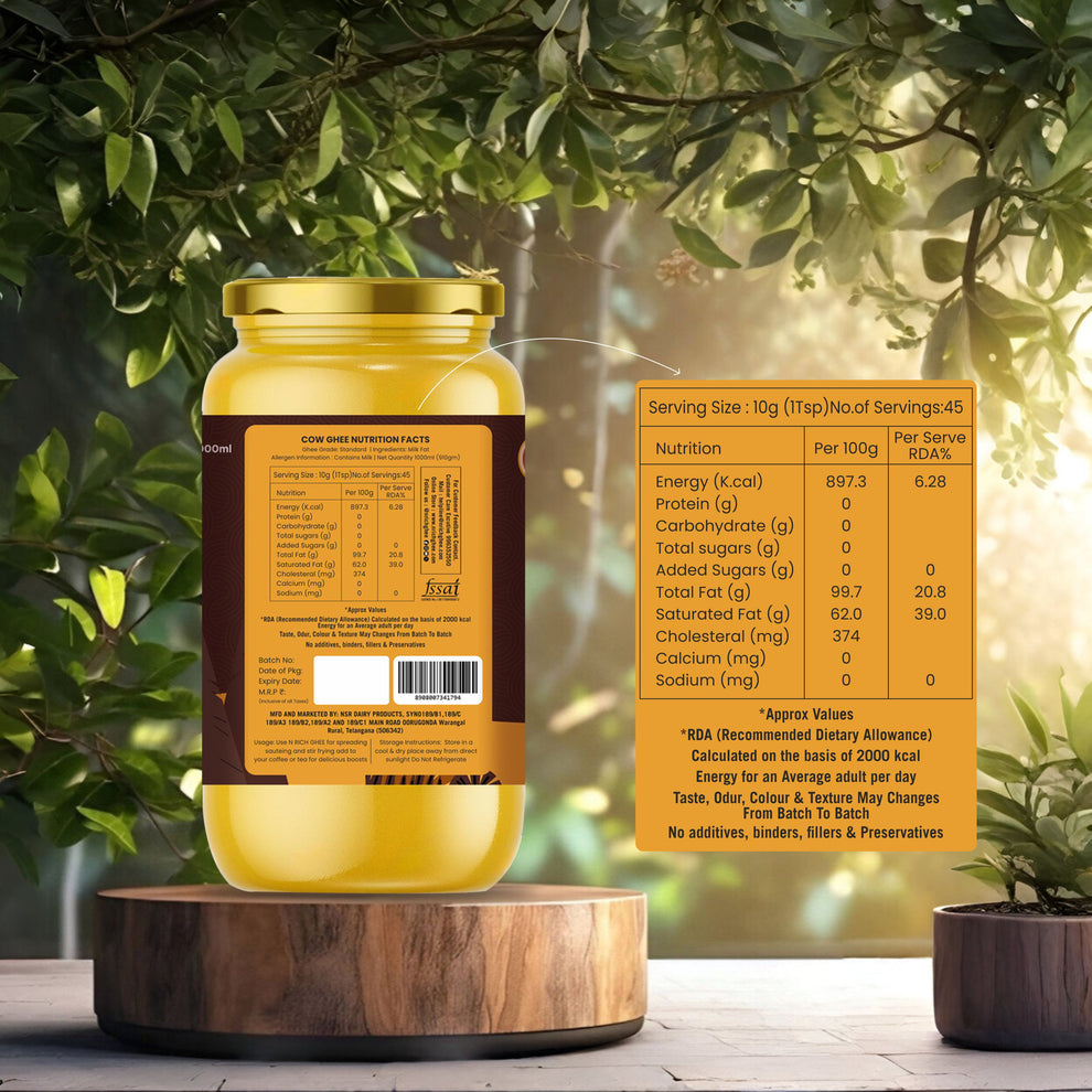 Crafted from the finest grass-fed cow’s milk, our Cow Ghee is a perfect blend of purity and nutrition. Rich in essential vitamins, it boosts immunity and adds a golden touch of flavor to your dishes. Ideal for traditional recipes, Ayurvedic rituals, and modern diets like keto, our ghee brings health and taste together.